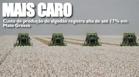 O custo de produção das lavouras de algodão em Mato Grosso registra significativo aumento para o planejamento da safra 2013/2014. Na região Sudeste do Estado a alta chega a 17% em relação à safra 2012/2013, de acordo com estimativas do Instituto Mato-grossense de Economia Agropecuária (Imea).